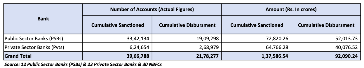 As of 03 Aug 2020, the total amount sanctioned under the 100% Emergency Credit Line Guarantee Scheme by #PSBs and private banks stands at Rs 1,37,586.54 crore, of which Rs 92,090.24 crore has already been disbursed. Here is the break-up: